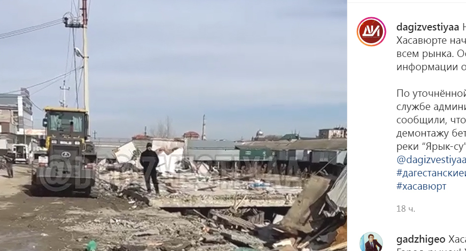 8 февраля в Instagram-паблике dagizvestiyaa был опубликован ролик, на кадрах которого показаны люди и техника, которые ведут работы по демонтажу зданий. "Нам пишут, что в Хасавюрте начался снос известного всем рынка. В пресс-службе администрации Хасавюрта сообщили, что проводятся работы по демонтажу бетонных эстакад в русле реки Ярыксу", – сказано в описании к видео.
