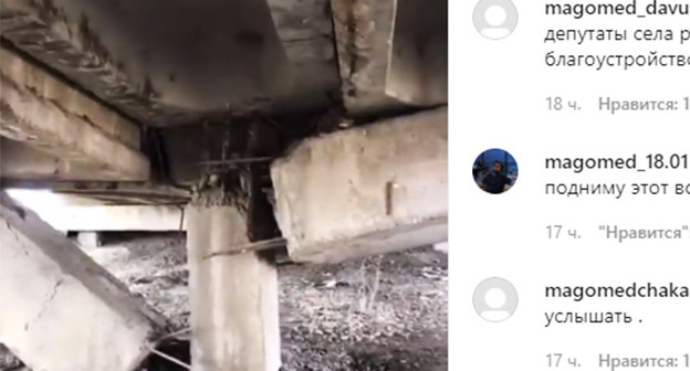 Мост в селе Унхада Тляратинского района находится в аварийном состоянии, и в случае его обрушения без сообщения останутся несколько сел. Кроме того, с наступлением весны начнутся полевые работы, а по мосту запрещен проезд техники, пожаловались местные жители в Instagram.