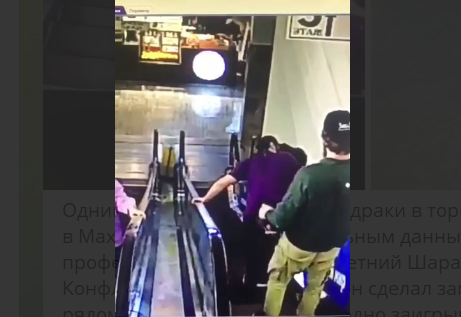 Видеозапись драки в торговом центре Махачкалы опубликована сегодня в Telegram-канале "Что там у дагестанцев?". Из нее следует, что стоявший на эскалаторе мужчина наклонился и поцеловал девушку, которая стояла на ступеньку ниже него. Несколькими ступеньками выше на эскалаторе ехал мужчина, который после того, как пара начала целоваться, подошел к ним. Затем, когда все трое спустились с эскалатора, девушка прошла вперед, а между мужчинами началась драка. Первым ударил тот, которому было сделано замечание. Дерущихся разняли несколько человек, следует из видео.