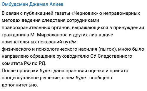 Уполномоченный по правам человека в Дагестане Джамал Алиев направил обращение в Следственный комитет в связи с публикацией "Черновика". "В связи с публикацией газеты "Черновик" о неправомерных методах ведения следствия сотрудниками правоохранительных органов, выражающихся в принуждении гражданина М. Мирзаханова и других лиц к даче признательных показаний путём физического и психологического насилия (пыток), мною было направлено обращение руководителю СУ Следственного комитета РФ по РД. После проверки будет дана правовая оценка и принято процессуальное решение, о чем будет сообщено дополнительно", – сообщил вечером 16 июня омбудсмен в своем Telegram-канале.