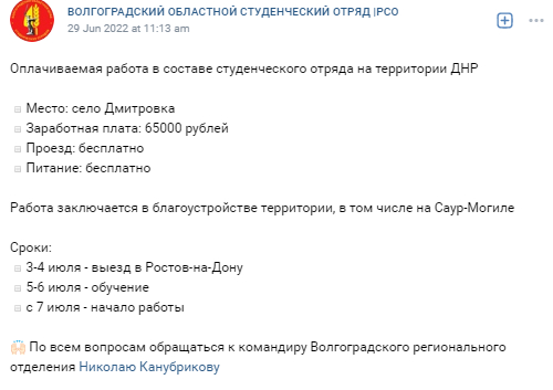 "Место: село Дмитровка. Заработная плата: 65000 рублей. Проезд: бесплатно. Питание: бесплатно. Работа заключается в благоустройстве территории, в том числе на Саур-Могиле. Сроки: 3-4 июля - выезд в Ростов-на-Дону, 5-6 июля – обучение, с 7 июля - начало работы", - указано в объявлении, опубликованном на странице Волгоградского областного студенческого отряда в соцсети "ВКонтакте".