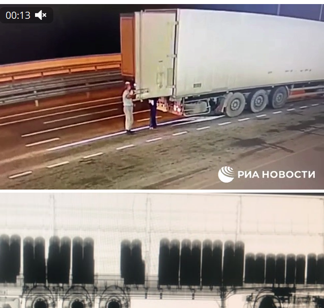 Сегодня было опубликовано видео досмотра фуры, которая по данным ФСБ, перевозила груз со взрывным устройством, и фото ("рентген- снимок") содержимого грузовика на таможенном посту, в частности, его разместил Telegram-канал РИА "Новости". На фото с рентгеном попала не взорвавшаяся фура, а второй грузовик — DAF с грузинскими номерами, на котором, согласно сообщению ФСБ, взрывное устройство пересекло границу Грузии и России, проинформировала сегодня "Медуза"*. На рентгене машина с меньшим количеством осей и запасным колесом в другом месте, сообщил сегодня Telegram-канал "Сирена". Речь в материалах ФСБ идет о грузовике марки DAF, который после взрыва обнаружили в Северной Осетии, указано в публикации.