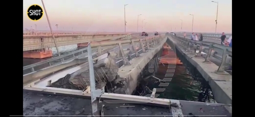 Два коротких видеоролика с места, как утверждается, происшествия на Крымском мосту обнародовал сегодня анонимный телеграм-канал Shot. "Публикуем видео с Крымского моста: разрушен пролёт в сторону Тамани. Другой пролёт — в направлении Керчи — просел", — говорится в аннотации к видео. На кадрах показан разрушенный пролет моста, похожего на Крымский. "Кавказский узел" не может проверить, когда и где было снято опубликованное видео.