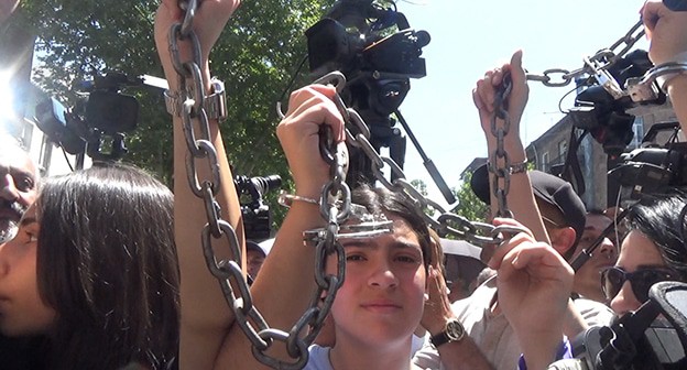 Баграт Галстанян на акции протеста заявил, что одно из требований движения на данный момент исполнено. "До сих пор нет обвинений против задержанных, а это значит, что с 17.00 [16.00 мск] они должны быть отпущены", - сказал он.