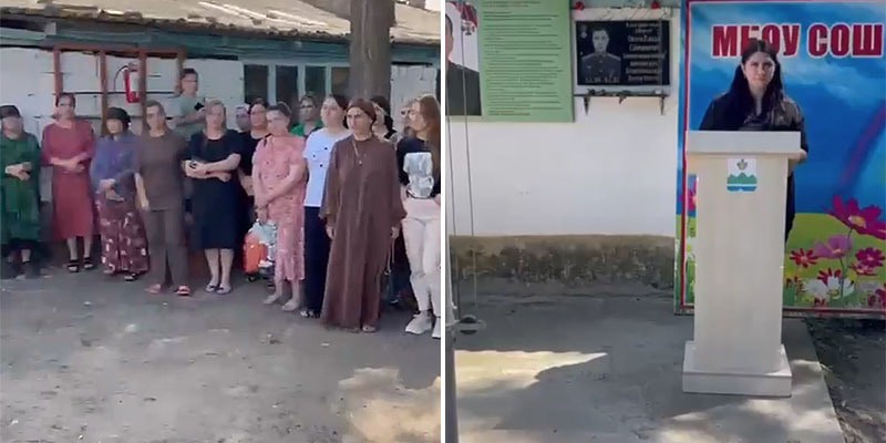 На видео показан двор школы, в котором собралось несколько десятков человек. Перед ними за трибуной стоит женщина. Она зачитывает текст обращения к Меликову от имени жителей поселка.