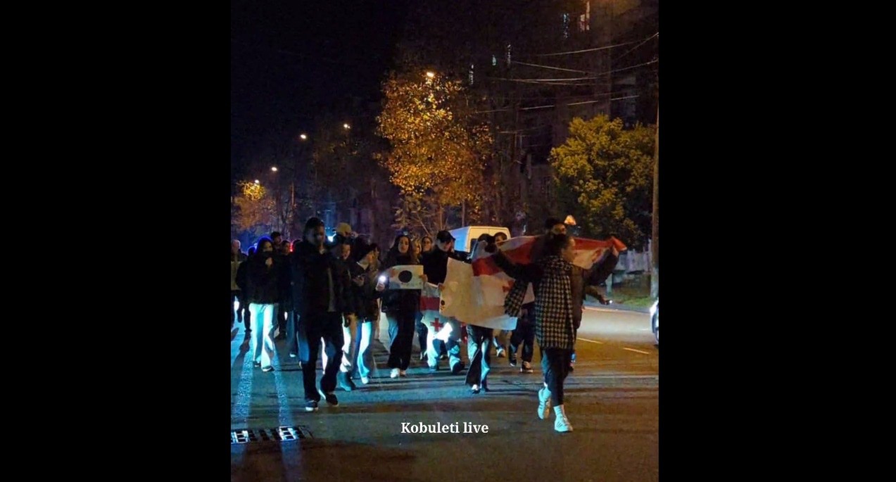 В Кобулети протестующие собрались на площади около мэрии и колонной пошли по улицам Агмашенебели и Руставели, говорится в публикации телеграм-канала.