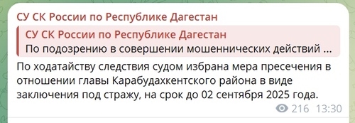 Как писал "Кавказский узел", 5 июля следствие сообщило, что глава Карабудахкентского района Махмуд Амиралиев задержан и обвинен в мошенничестве.