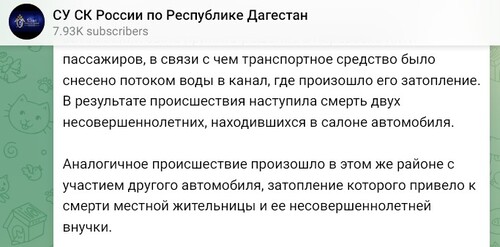 При этом следствие 6 апреля объявило бабушку девочки умершей. Согласно публикации Следственного комитета, затопление автомобиля в Дербентском районе "привело к смерти местной жительницы и ее несовершеннолетней внучки". Кроме того, в том же районе при затоплении другого автомобиля "наступила смерть двух несовершеннолетних, находившихся в салоне".