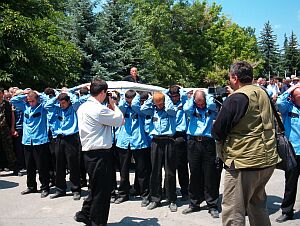 Сегодня утром захваченных южноосетинскими силовиками грузинских военнослужащих (которых в республике называют членами бандформирования) привезли на Театральную площадь Цхинвала, где пленники были поставлены на колени. Изъятое у них в большом количестве оружие - автоматы, пулеметы, гранатометы, в большом количестве патроны - были разложены прямо на асфальте. Надо сказать, что как раз в это время на площади проходил митинг осетинских матерей, потерявших своих сыновей во время вооруженного конфликта 1991-1992 года. Вопреки ожиданиям, женщины выразили не гнев, а жалость по отношению к пленным, подавляющее большинство которых являются совершенно молодыми людьми, некоторые из которых не скрывали слез. На одном из оружейных ящиков были разложены документы некоторых задержанных, в основном паспорта.