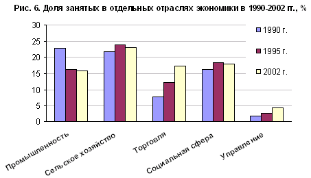 Сокращение среднегодовой численности занятых за 1990–2002 гг. составило почти 300 тыс. человек, хотя население края выросло за эти годы примерно на такую же величину (более чем на 10%). При этом отраслевая структура занятости стала еще более аграрной (23% занятых) и "сервисной" (рис. 6). Доля занятых в торговле выросла в 2,5 раза, что отражает общую тенденцию перехода избыточной рабочей силы из реального сектора в сектор услуг. Растет бюджетная занятость: в 2,3 раза выросла доля занятых в управлении, увеличилась занятость в отраслях социальной сферы (здравоохранении, образовании, культуре). При этом на треть сократилась занятость в промышленности, вдвое — в строительстве. Эти тенденции отражают общероссийскую ситуацию и типичны для многих регионов страны. Но есть и отличия: аграрная занятость в крае сокращается медленнее, чем в целом по стране.