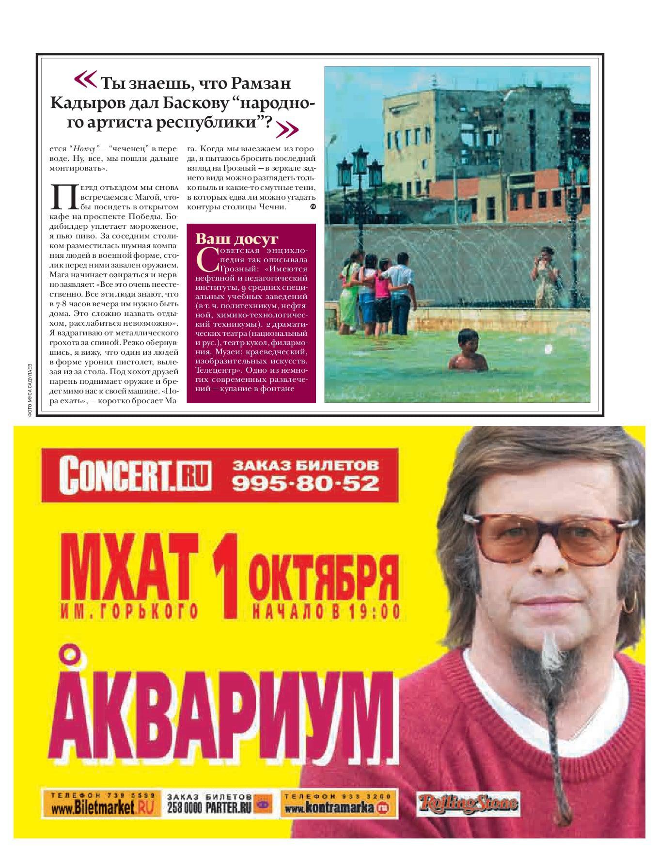в 2005-м году в Грозном должны были провести масштабный всероссийский рок-фестиваль. я ухватился за эту идею, чтобы написать репортаж, но за пару дней до начала фестиваля объявили о его отмене по причинам безопасности. все-таки, Грозный в 2005 году был не самым спокойным городом. но я все же поехал, чтобы написать о том, какая есть в республике культурная жизнь. в итоге репортаж вышел в крутом журнальчике Rolling Stone и стал одним из первых по сути текстов из Грозного не на тему войны. предлагаю к прочтению. в сети его кстати нет, так что, в интернете публикуется впервые.