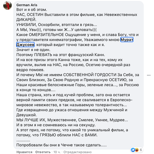 но нет. комментарии просто жесть. причем первые два принадлежат известному в Осетии кинорежиссеру. я не собираюсь это комментировать, но оставлю это здесь, чтобы было. все они взяты из неподзамочной публикации, то есть, из открытых источников. что движет людьми относиться вот так негативно к фильму, которого еще никто не видел – для меня загадка. тем более, что фильм явно непростой, небанальный и делать выводы о нем по чьим-то рецензиям невозможно.