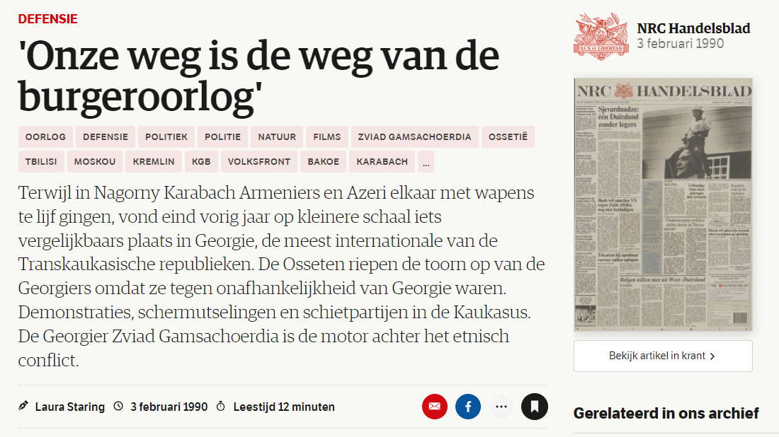отличную работу проделали осетинские активисты - нашли в архивах нидерландской газеты «НРК Ханделсблад» репортаж из Тбилиси начала 1990 года и перевели его на русский.