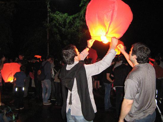 Башлык - непременный атрибут костюма современных горцев в дни особых выходов. На фото - молодые люди зажигают фонарики в День Памяти и Скорби 21 мая. Нальчик.