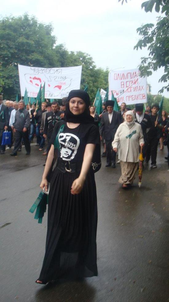 Это - Гупса Шеуджен, ее семья репатриировалась в Адыгею из Турции более 15 лет назад. Майкоп, шествие 21 мая 2012.