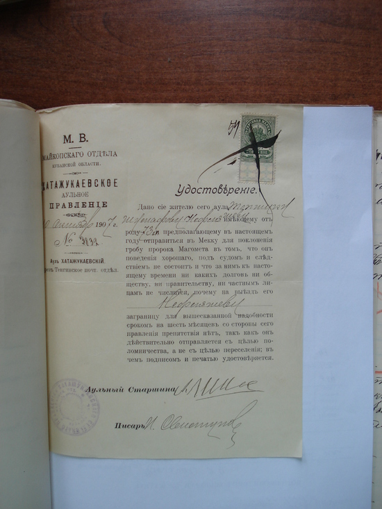 Такие удостоверения выдавались в аульных правлениях горцам Кубанской области, выезжающим в Мекку в начале ХХ века. Государственный архив Краснодарского края. Публикуется впервые.