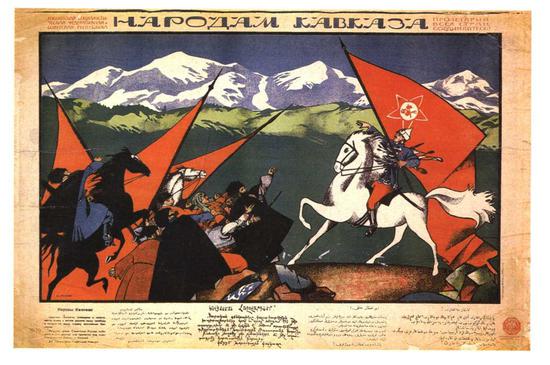 В годы Гражданской войны плакатная советская пропаганда в первую очередь пыталась убедить народы Кавказа, что есть платформа, на которой они могут объединиться с Советами – ведь и тех, и других объединяет общий враг – царизм, буржуазия, местные кулаки.