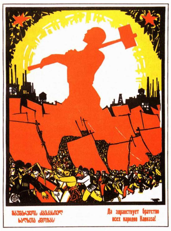 Тема братства продолжается в плакате Дени "Да здравствует братство всех народов Кавказа!", где рабочий с молотом словно парит над всеми народами Кавказа (внизу нарисованы горцы в черкесках и горянки в традиционной одежде, которых революционный поток увлек к светлому будущему) объединяя их под красными знаменами  революционными идеями.