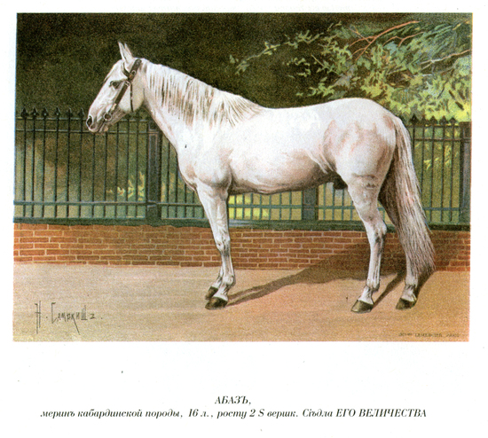 Его описа­ние приводит Хан-Гирей: «Удивительно, с какою неутомимостью и тщанием черкесы содержат верховых лошадей: дважды в году они откармливают своих любимых коней: летом при наступлении жаров и зимою при наступлении стужи. Откармливаемую летом лошадь ставят в конюшню, со тщанием обмазанную глиною и темную, чтобы мухи не беспокоили лошадей, в ней содержимых.