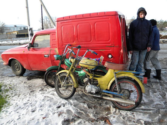 На фото: помощники Евгения Кудинова - кущевские школьники со своими транспортными средствами рядом с его красным "пирожком"