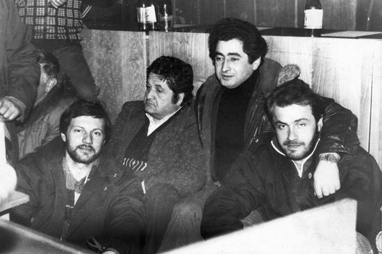 Крайний справа - Алан Качмазов, в период его активности в "Адамон Ныхас". Далее, слева-направо, Славик Квезеров (предприниматель, скончался в 2011), Алан Чочиев (лидер "Адамон Ныхас", в политической эмиграции в Германии), Славик Джанаев (священник, живет в Греции). В итоге, никто из этих людей, строивших Республику в 90-х, не живет в ней сегодня.