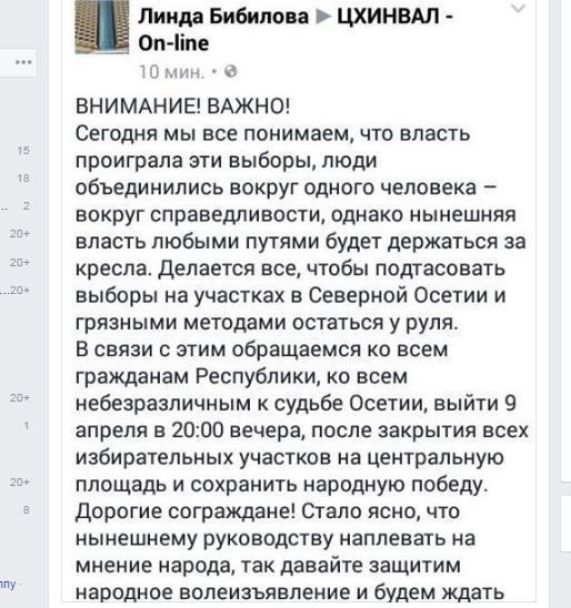 Сегодня в соцсетях появились призывы, выйти на Театральную площадь после завершения голосования 9-го апреля,  и таким образом "сохранить народную победу". Было объявлено, что выборы будут подтасованы и что надо объединится,  вокруг одного человека,  который  есть сама справедливость. Кто этот человек,  указано не было. А выборы, по мнению авторов призыва, подтасовывает нынешняя власть, надо понимать, с целью оставления нынешнего президента Тибилова  у неё, у власти,  то бишь,  с целью его переизбрания на новый срок. Смотрели фильм "Хроника объявленной смерти", ну может, читали повесть Маркеса. Вероятно,  призывающие  сорвать выборы акцией общественного  неповиновения, если результаты будут не в их пользу,   зачитывались этим произведением.  А помните 2011? Тогда, до объявления результатов голосования, сторонники Бибилова начали митинг-празднования еще/так и не  одержанной победы. Сейчас , та же история, только уже с митингом протеста против пока, не то что не выявленных, но еще и не совершенных нарушений.