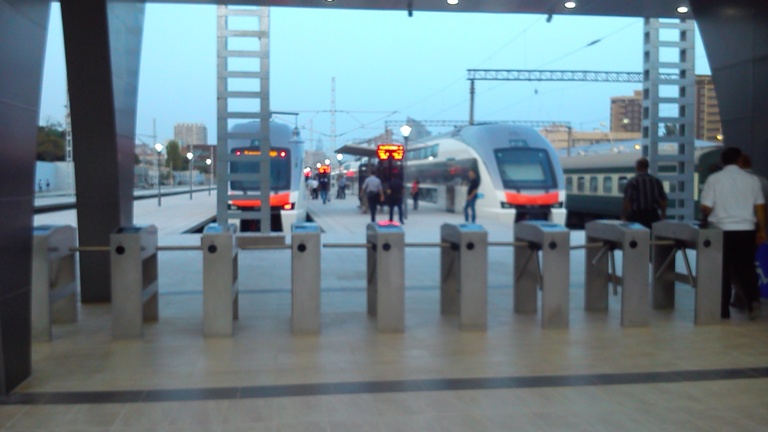 Вход на перрон к скоростным поездам через турникеты для оплаты проезда. С сегодняшнего дня до Сумгайыта из Баку - за 80 гяп. До промежуточных станций, а их 5, цена меньше.