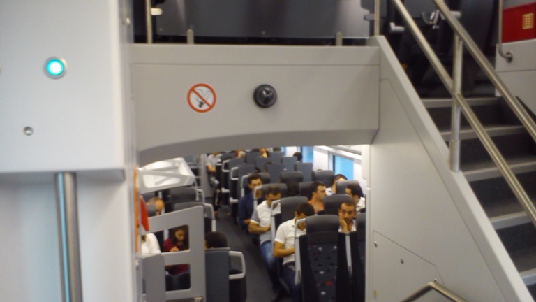 Дальше будет про скоростной поезд. Пока он движется медленно, так как график движения еще не определен точно, по бокам от путей нет ограждений. На пути в Сумгайыт, а двигался он туда 1 час 5 минут, поезд однажды разогнался до 86 км в час, что видно по табло над дверями. В основном скорость 59 км в час. Туда я ехал на первом этаже вагона, обратно - пересел на второй этаж.