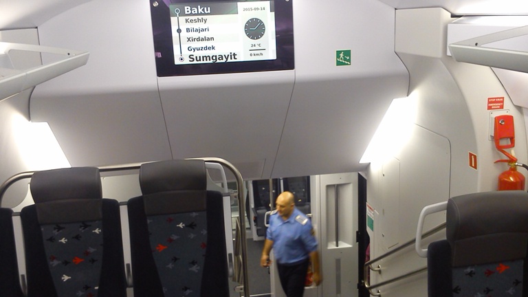 Из Баку в Сумгайыт вечерним рейсом едет рабочий люд. Внешность пассажиров диссонирует с швейцарским убранством поезда. Если закрыть глаза и слушать разговоры, то как будто едешь в советской электричке. Разница в том, что новый поезд движения очень плавно, без рывков и почти бесшумно. В салоне слышны звуки кино и телепрограмм, и музыки раздающиеся из планшетов и телефонов пассажиров. Многие уткнулись в интернет