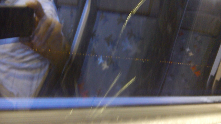 Второе ЧП со стеклом, на этот раз в моем присутствии. Смотрю - сбежались полиция, машинист и смотрят на трещины в стекле нашего вагона. Обсудили и решили, что это не камень брошенный с дороги, а стекло лопнуло само, снаружи. Мое мнение - причина термическая, стекло треснуло из-за разницы температуры внутри салона (24 градуса, кондиционер) и снаружи (около 34 град).