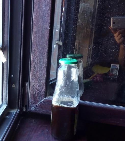 Потемневший и сильно уменьшившийся в количестве концентрированный сок залил в бутылку. Получилось около 300 мг чистого экологически идеального средства против ОРЗ,