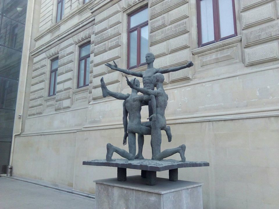 Не буду рассуждать о художественной ценности этой скульптурной группы, давно выставленной на улице, рядом с Музеем искусств. Вы скажете - я профан в искусстве, ничего не смыслю в абстракции. Хорошо, я валенок в искусстве. Но мне то, что делают три металлических мужчины не нравится. Если ничего не знать и судить по азербайджанцам только по этому так называемому произведению так называемых искусств, то современная Европы с ее сексуальной толерантностью пешком под стол ходила, когда мы вот такие были.