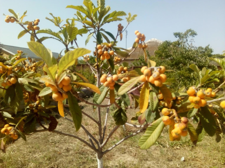 В саду полный расцвет. Мои сельскохозяйственные труды дают плоды. На фото интересное дерево мушмула, его желтые плоды полны сладкого сока. 3-4 плода во рту достаточно чтобы появился эффект выпитого лимонада, только надо крупные косточки выплюнуть. Дерево вечнозеленое, неприхотливое, красивое.