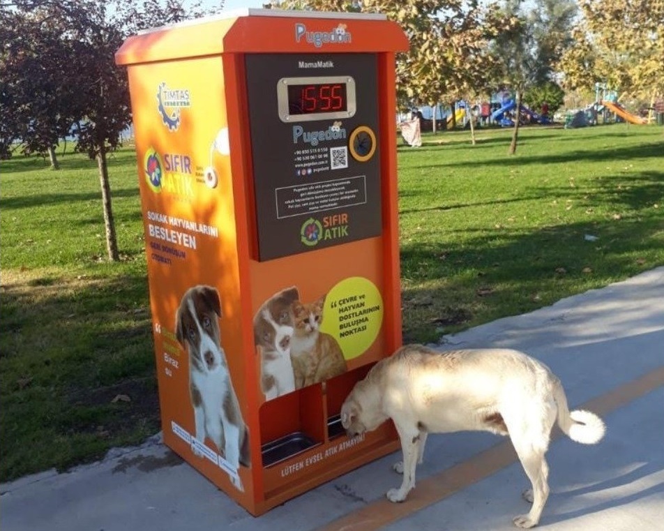 На этой фотографии установленный в Турции уличный автомат. Фандомат принимает пластиковые и стеклянные бутылки, а также алюминиевые банки. В обмен автомат выдает порцию корма и воды для животных.