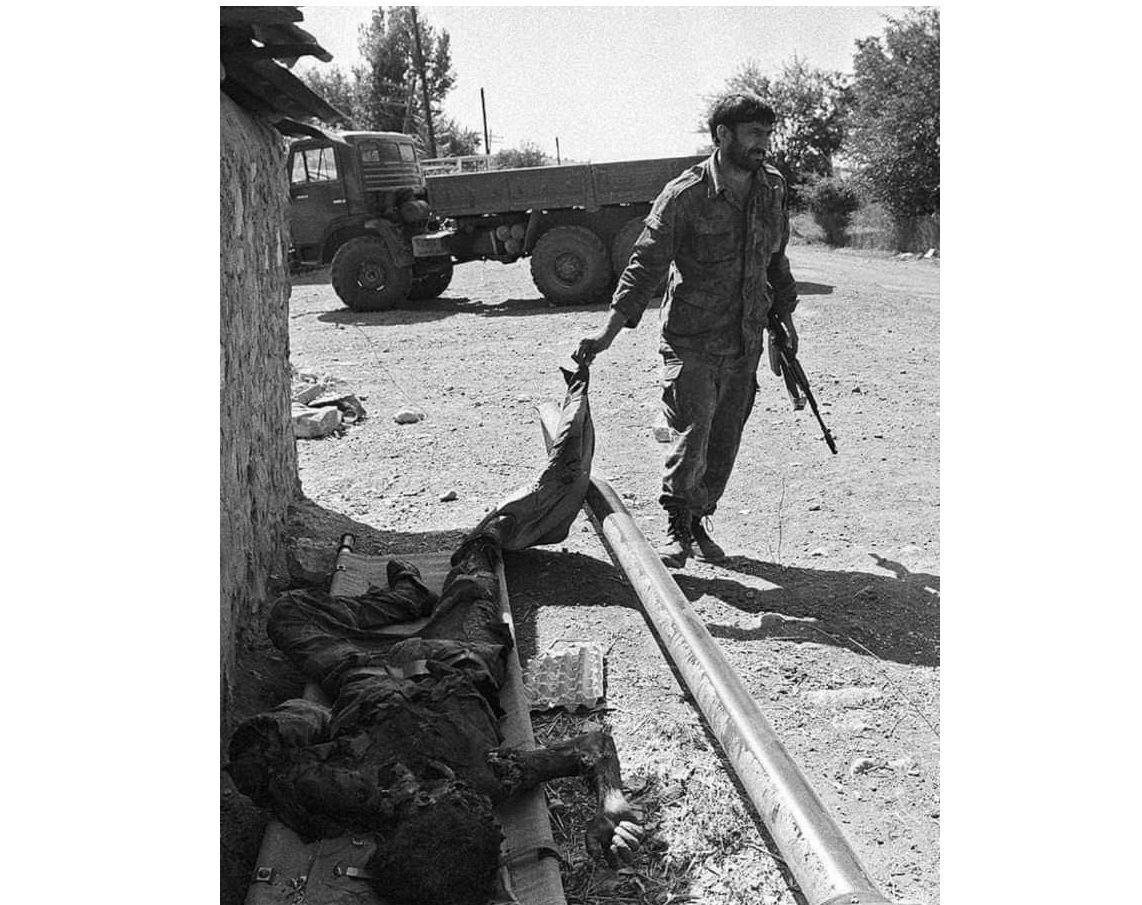 Есть другой фотоснимок  его преступных действий во время первой карабахской войны. На фото Хачатрян, держит неясный предмет, вытягивает его с носилок, на которых уложено тело азербайджанского солдата. Что он тянет - Хачатрян скажет скоро на допросах, а может, уже заливается соловьем, надиктовывая имена-фамилии подельников и командиров, перечисляя количество убитых ими и указывая на карте места.