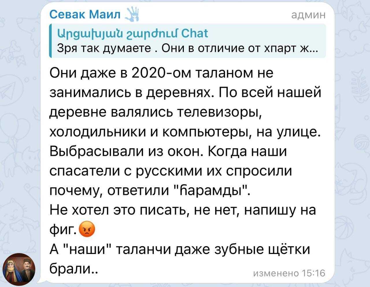 И вот еще по теме. @MaidenTower пишет: Армянин, воевавший в Первую Карабахскую войну (1991-1994) рассказывает о том, как армяне занимались грабежом (талан), вынося из домов азербайджанцев даже зубные щётки. При этом этот же армянин подтверждает, что азербайджанцы грабежом не занимались.