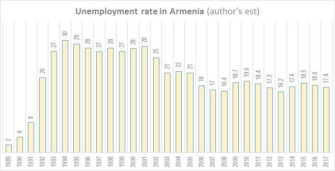 Данных по безработице за весь период не существует. Армения по меньшей мере два раза меняла методологию расчета безработицы и с 2008 года используется методология Международной организации труда (ILO), но для ее сопоставимости с предыдущими данными пришлось использовать экспертную оценку на основании данных, представленных в IMF World Economic Outlook 2017. Оценочные данные, использованные для расчета, представлены на графике:
