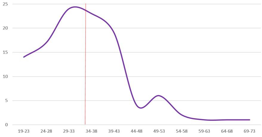 Медианный возраст и здесь ниже среднего, то же касается модального. Медианный возраст составляет 34 года и 1 месяц, то есть на 9 месяцев ниже среднего.