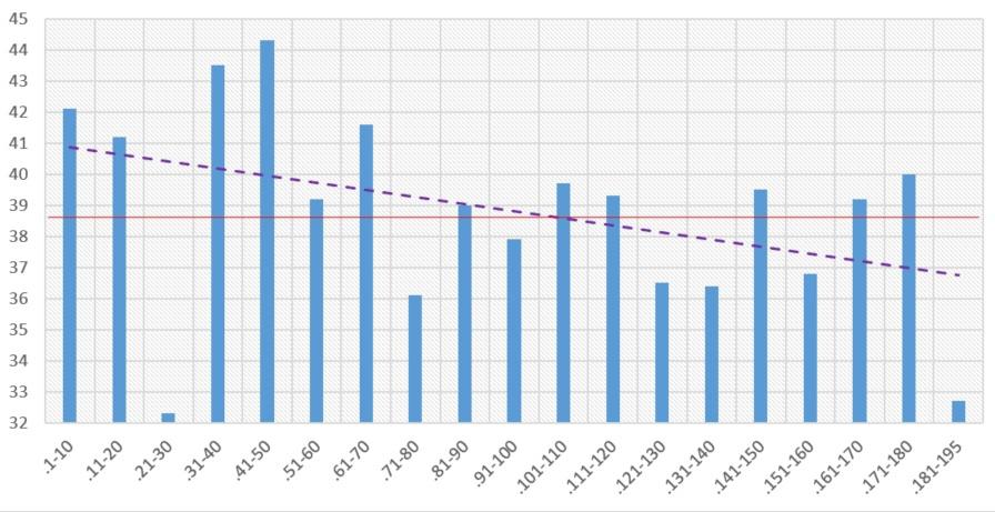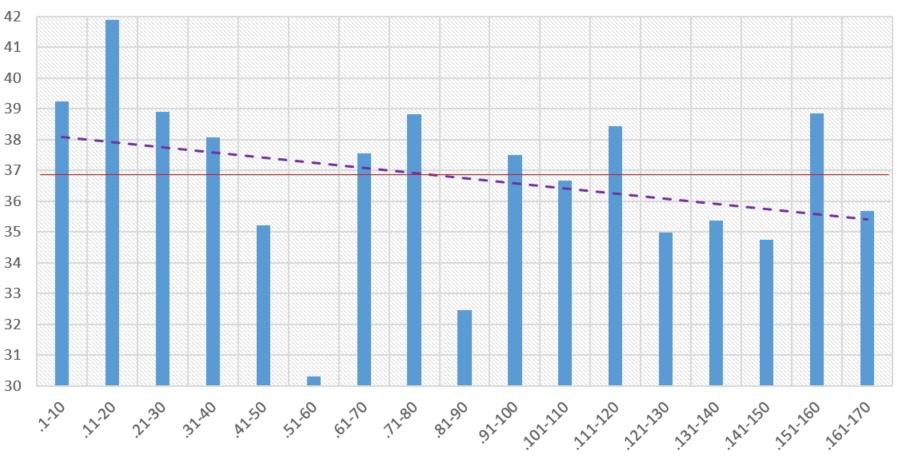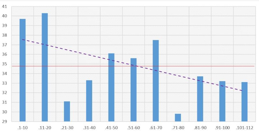 По оси Х (нижняя горизонтальная) указаны номера в списке, по оси Y (слева, вертикальная) указан возраст. Каждый столбец обозначает средний возраст десятки членов списка. Красная линия – средний возраст всего списка. Фиолетовая прерывистая линия – линейный тренд.