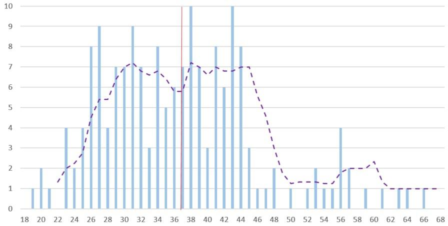 Внизу – возраст кандидатов в список Совета старейшин, а слева – количество этих кандидатов по каждому возрасту. Красная линия вновь показывает средний возраст, тогда как фиолетовая прерывистая – усредненное число кандидатов по 5-летним возрастным группам.