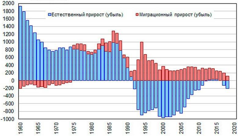Тема ухудшающейся демографической ситуации в России обсуждается в СМИ и экспертных кругах уже около двух лет. Резко ухудшился баланс по всем направлениям. В 2018 году естественная убыль населения составила 224 566 человек и еще 106 700 человек – за 1 квартал 2019 года, то есть всего лишь за 15 месяцев 330 тысяч или 22 тысячи в месяц, что уже существенно даже для такой большой страны как Россия. Миграционный прирост в России в 2018 году составил 124.9 тысяч человек и таким образом общая убыль населения в 2018 году составила 100 тысяч человек. Это означает, что впервые за 10 лет миграционный прирост не перекрыл естественной убыли населения. В полувековой перспективе это выглядит следующим образом.