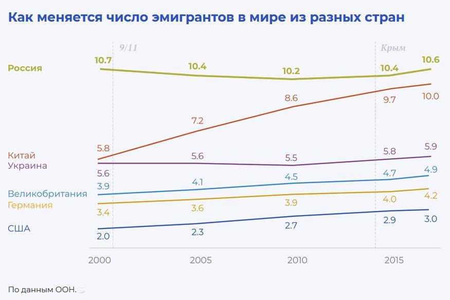В начале 2019 года на сайте «Проект.медиа» вышла публикация под названием «Иной русский мир. Исследование о том, сколько россиян уезжают из страны». Авторы привели статистику migrant stock ООН, по которой в мире на сегодня 10 миллионов 600 тысяч мигрантов из России, причем по этому показателю Россия на третьем месте в мире после Индии и Мексики. Что важно, это число перестало сокращаться и начало расти.