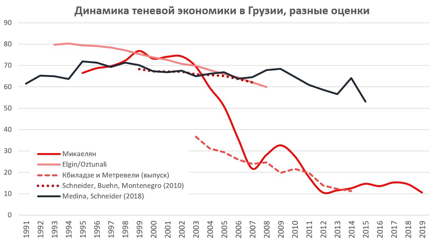 Стоит отметить, что оценки, сделанные на основе метода MIMIC и его модификаций (DYMIMIC и пр.), «не заметили» радикального снижения тени в 2004-7 гг., поскольку в них включено огромное количество косвенных индикаторов. На глобальной выборке это все работает неплохо, но в отдельных случаях, к примеру, в Грузии – это уже практически не работает. См. также Михаил Саакашвили, реформы и экономический рост в Грузии (21 декабря 2017). В остальном – большинство оценок находятся в своем регистре и не отражают тех изменений, которые произошли в Грузии в середине 2000-ых гг.