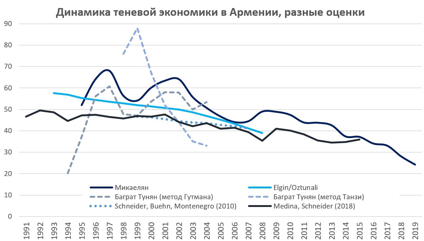 Я давно занимаюсь теневой экономикой, в частности, Армении и уже написал несколько работ в этом направлении, например обзор “Informal Economy of Armenia Reconsidered” (CAD, 2015), книги «War, Business & Politics. Informal Networks and Formal Institutions in Armenia» (в соавторстве, 2016), «Теневая экономика в Армении» (2017), статью «Трудности постсоветского транзита Армении: разрыв ожиданий с реальностью, экономический спад и теневая экономика» (2019).