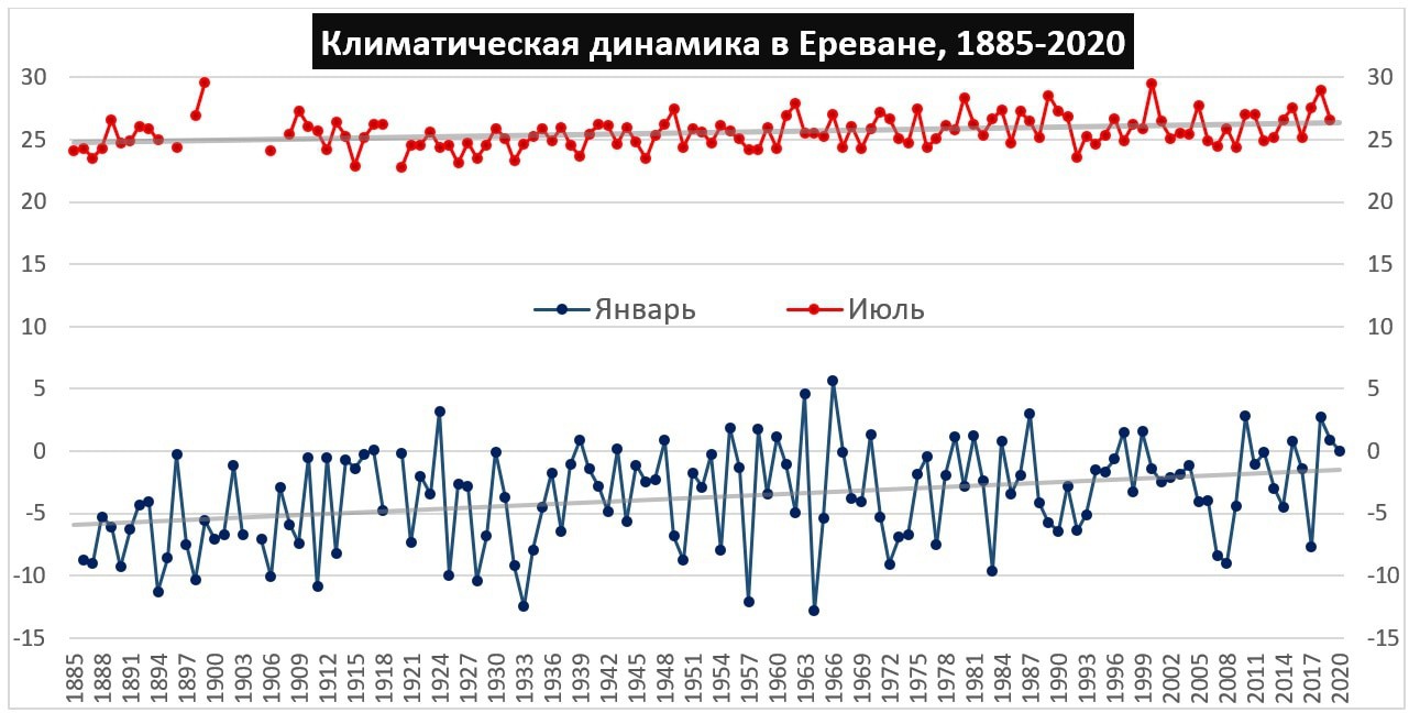 Климат планеты резко меняется и это неопровержимый факт. К сожалению, климат планеты меняется настолько быстро, что это может заметить каждый, то есть, речь не идет о геологических или астрономических процессах – каждый может вспомнить погоду в начале 2000-ых и сейчас – и это совершенно разные вещи. Ниже можно увидеть данные по поводу того, как это менялось, на примере Еревана. Эти изменения столь значительны, что ни мы, ни другие виды, не успевают адаптироваться.