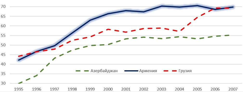 График 3. Динамика индекса экономической свободы Армении и соседей, 1995-2007