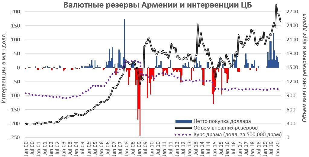 В Армении Центральный Банк тоже влиял на курс драма. В январе-феврале 2003 года, например, были сделаны интервенции в размере 25 млн долл., то есть, ЦБ искусственно завысил курс драма, а когда в страну пошел приток валюты, отказался его занижать или стабилизировать. Политика, направленная на завышение курса драма (или как минимум его стабилизацию), а также на подавление инфляции являлась наследием 1990-ых, точнее, попыткой преодолеть их, хаос и экономическую нестабильность, царившую тогда. Но когда экономическая ситуация изменилась, сохранение этих подходов вредно (а эта политика, между прочим, проводилась не только в 2000е, но и в 2010е и даже сейчас).