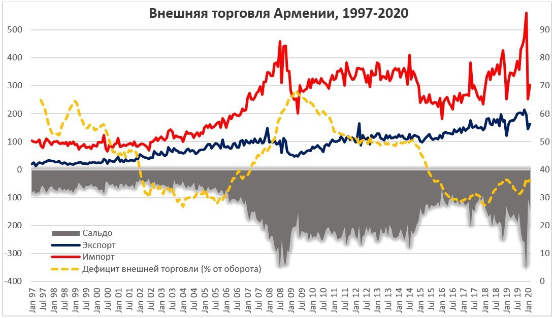 Однако самым тяжелым последствием для экономики был подрыв экспортного потенциала страны. Если с 1997 по 2002 гг. экспорт рос быстрее импорта и отрицательный баланс внешней торговли постепенно сокращался, то с 2004 года ситуация изменилась и отрицательный баланс начал быстро расти, достигнув максимума непосредственно перед кризисом, когда ежемесячный импорт составлял более 400 миллионов долларов. Импортная ориентация экономики сохранялась до конца 2014 года, когда импорт обвалился из-за сокращения спроса. А сокращение спроса произошло из-за того, что экономика Армении почти не росла на протяжении уже 6 лет. Для того, чтобы оценить динамику, взглянем на график ежемесячной динамики внешней торговли Армении.