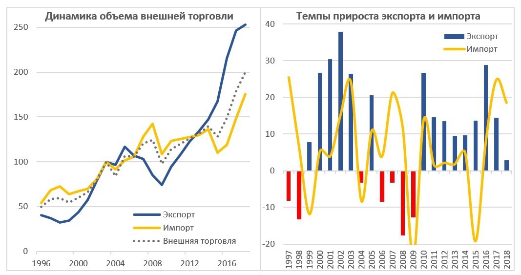 Однако эти цены приведены в долларах. Несмотря на то, что это постоянные доллары, но они не учитывают специфику внешней торговли Армении, а только общую инфляцию доллара. Для учета армянской специфики, можно использовать специальные индексы цен, рассчитываемые Статистическим комитетом Армении. К примеру, в 2003 году экспорт из Армении составил 686 млн долл., а в 2008 – 1,057 млн., но физический объем экспорта сократился. Ниже представлена динамика физического объема экспорта и импорта с 1996 по 2018 г.