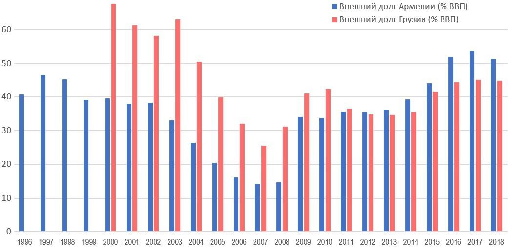 Как мы видим, следствием политики высокого драма стал большой внешний долг, поскольку большое отрицательное сальдо внешней торговли вымывало из Армении капитал. В то же время консервативная политика ЦБ Грузии привела к тому, что долговая нагрузка на грузинскую экономику уже ниже, чем на армянскую.